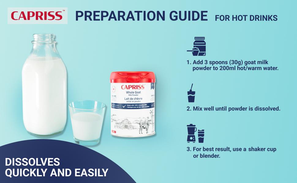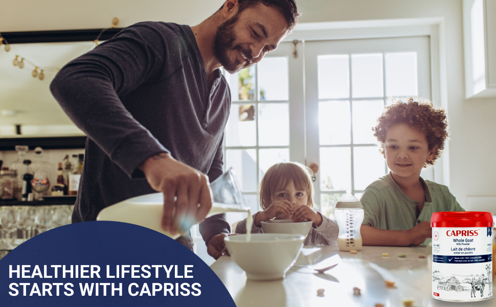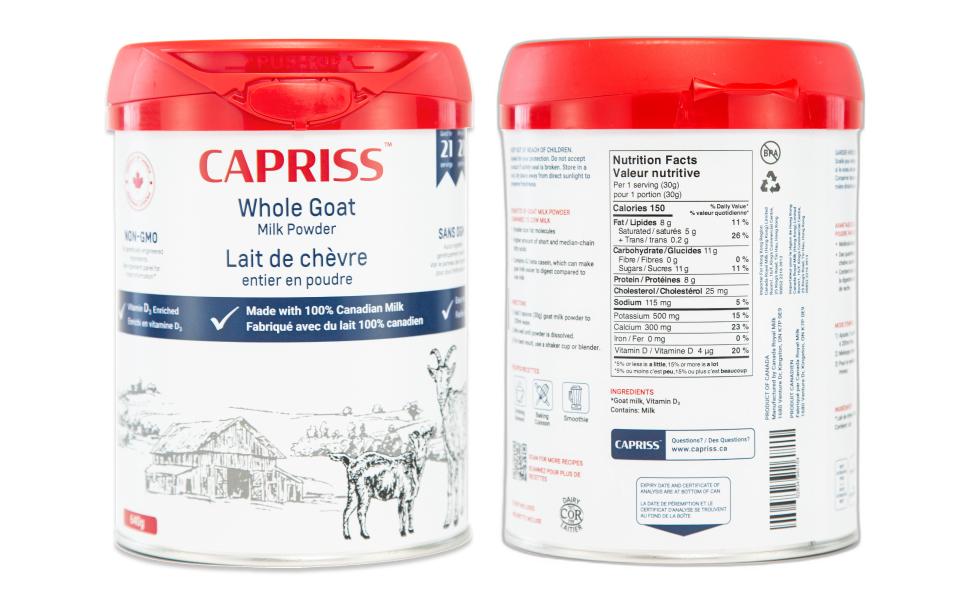 CAPRISS is a premium, 100% Canadian whole goat milk powder suitable for health-conscious individuals of all ages. Enriched with vitamin D, it offers a nutrient-rich dairy option for those seeking an alternative to traditional milk and is also friendly for those with lactose intolerance. With a creamy flavor profile, CAPRISS is free from the typical 'goaty' taste often associated with goat milk. It is certified as both halal and kosher. Discover the joy of CAPRISS with your family today!