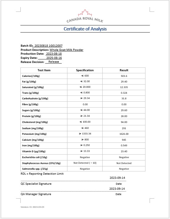 Our goat milk supply is proudly sourced from Ontario Goat Dairy Co-operative (OGDC) farmers and is immediately chilled below 4 degrees Celsius upon arrival to ensure freshness.